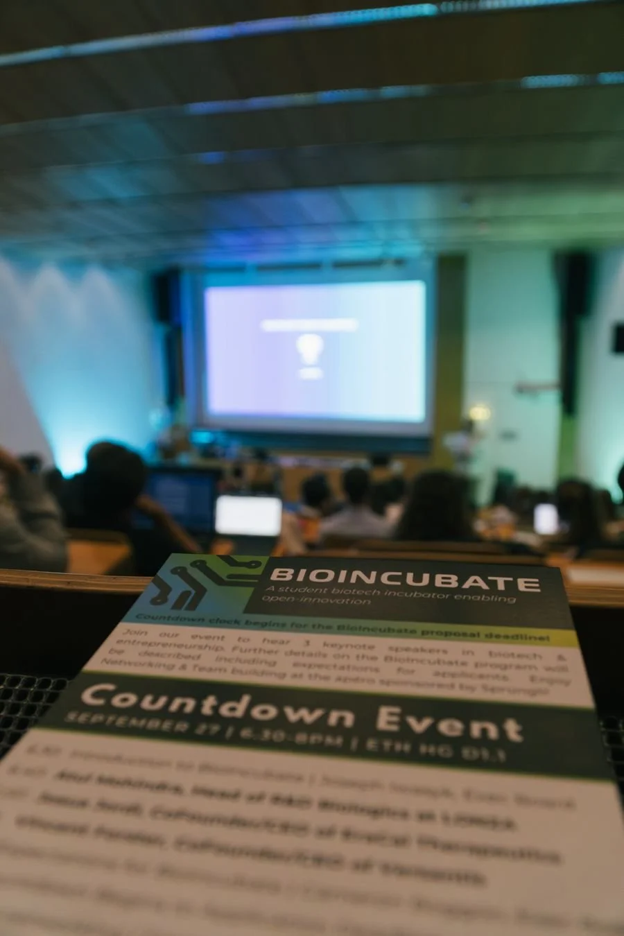 We marked our calendars for the  countdown event that featured three captivating keynote talks in the field of biotechnology. We were delighted to hear the Head of R&D Biologics at LONZA presenting an enlightening talk on innovation in biomanufacturing. Additionally, we had the privilege of hosting two entrepreneurial founders who shared their insights. The first keynote speaker was the Cofounder and CSO of Versantis, an ETH spin-off, while the second speaker was the Cofounder and CEO of EraCal Therapeutics, a spin-off from UZH and Harvard. During the event, we also provided comprehensive information about the BioIncubate program, including the expectations for prospective applicants. To coonclude the event we had a Sprüngli apero where attendees could network and further engage with like-minded individuals passionate about the biotech industry.